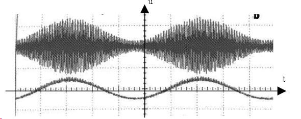 On observe alors un phénomène de battements sur l’oscillogramme. On retrouve la fréquence de la porteuse dans les oscillations et l’enveloppe de celles -ci correspond au signal modulant.