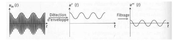 La démodulation consiste à récupérer le signal informatif modulant qui est contenu dans la partie supérieure (ou inférieure) de l’enveloppe du signal modulé en amplitude. Pour séparer le signal modulant de la porteuse, il faut éliminer le signal a haute fréquence pour ne garder que la fréquence du signal modulant, soit la fréquence de l’enveloppe du signal modulé.